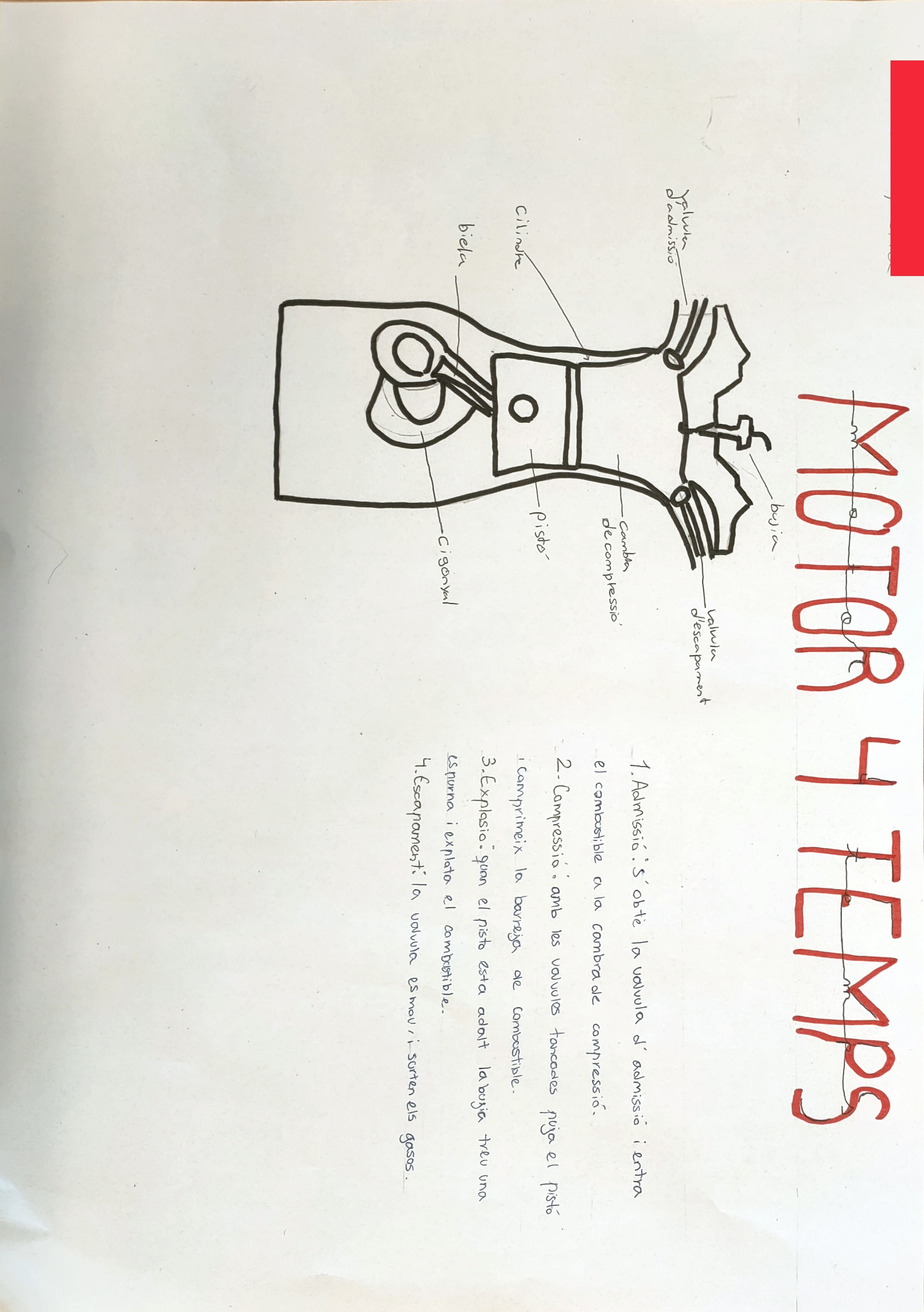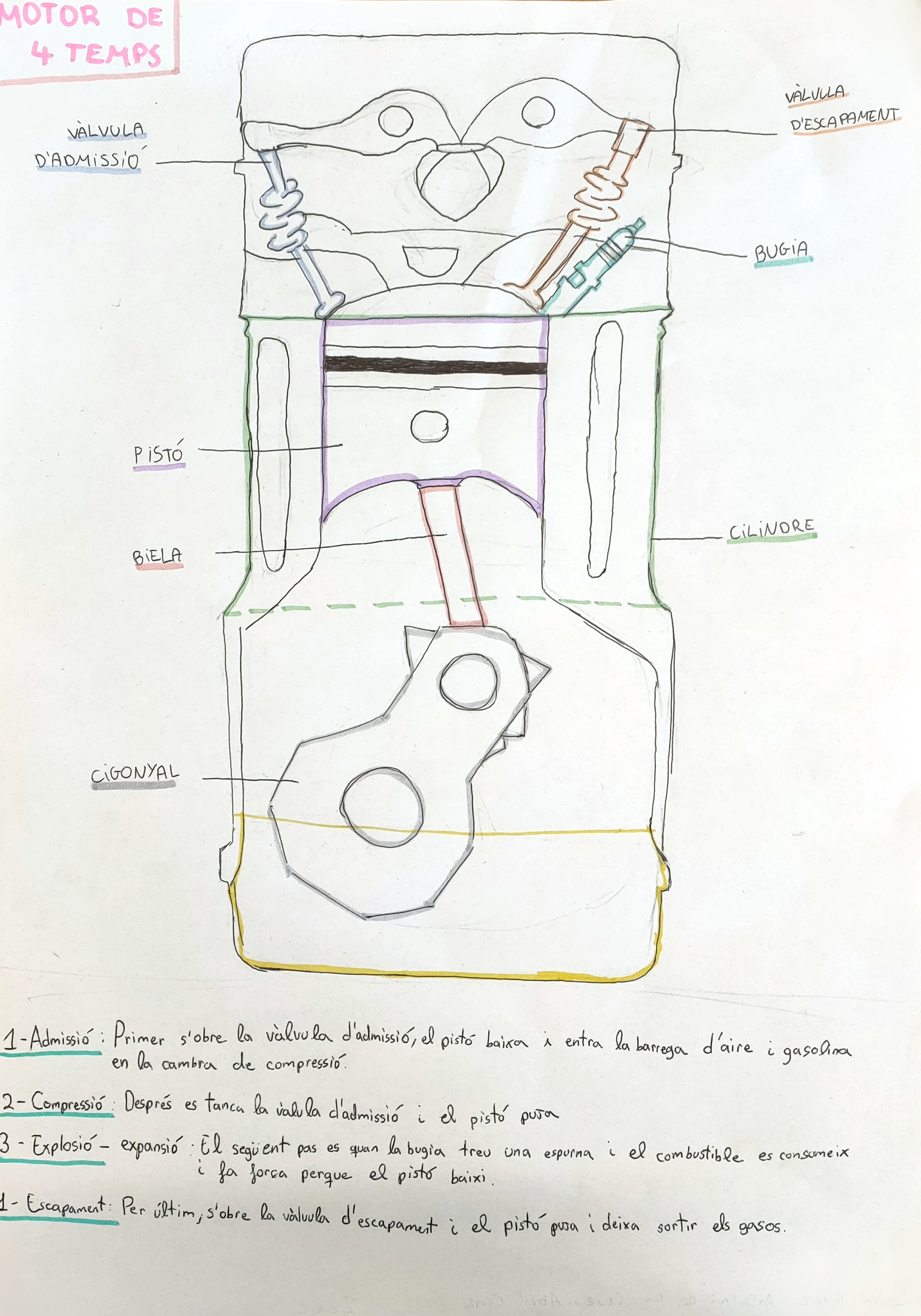 A continuació pots veure les parts d’un motor de quatre temps i les quatre fases dibuixades.