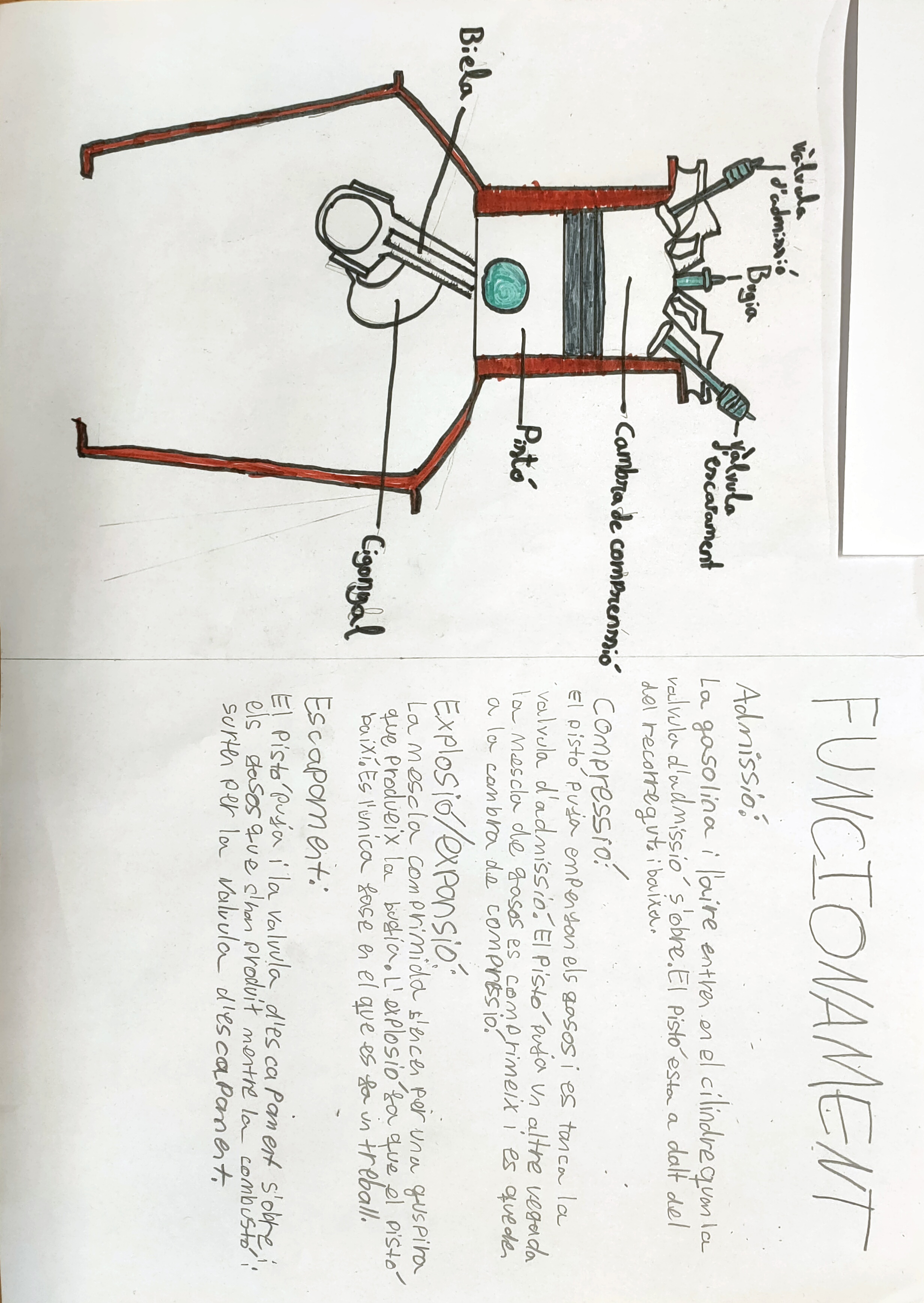 - Escapament: S’obre una altra vàlvula. El pistó torna a pujar per expulsar els fums de l’explosió cap al tub d’escapament. I el cicle torna a començar!
